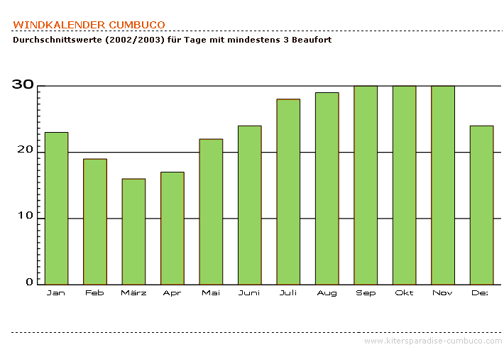 Von Juni bis Dezember nimmt der Wind täglich zu, und wir haben täglich Wind - gleichmäßig, den ganzen Tag über und jeden Tag.